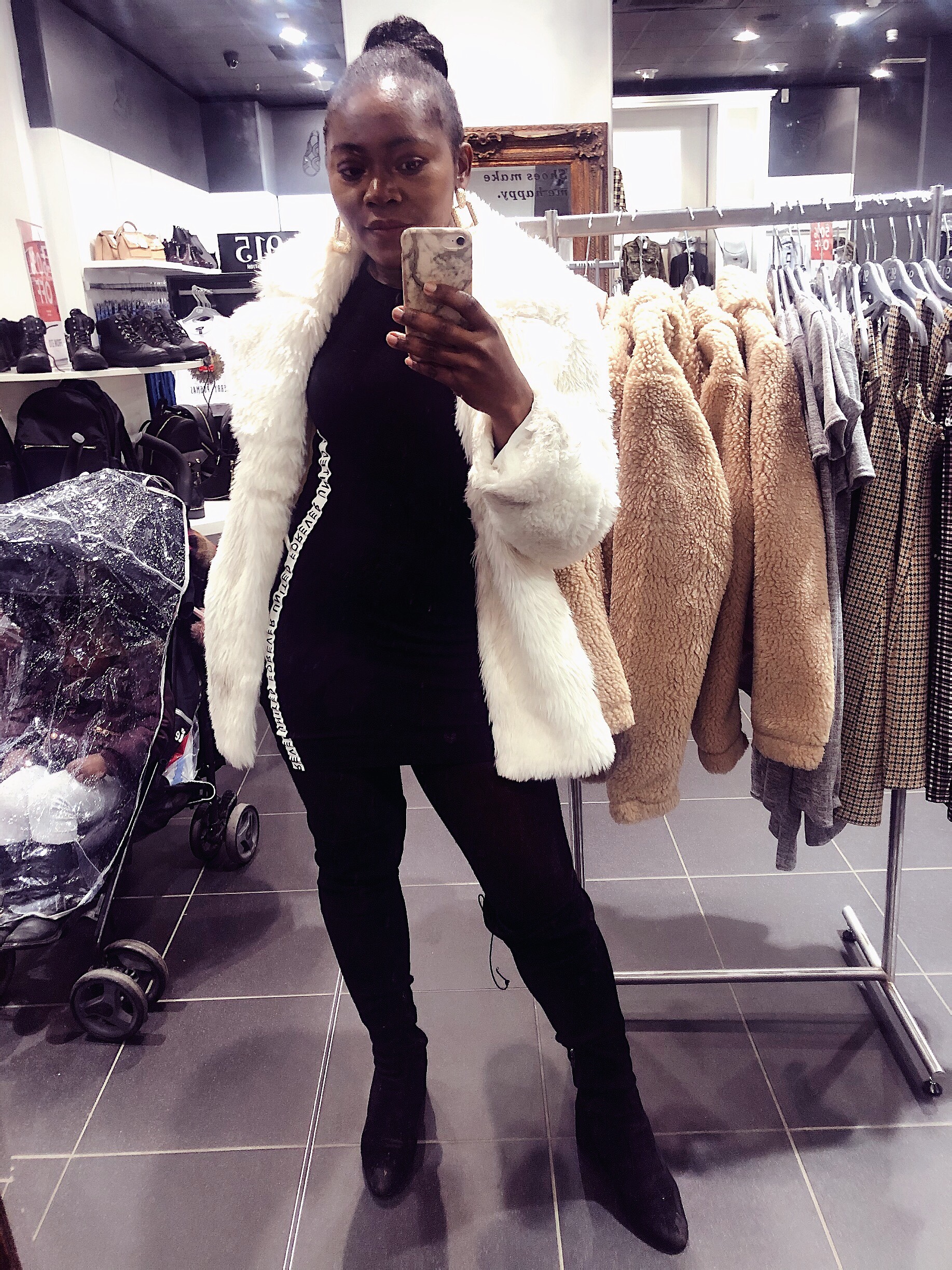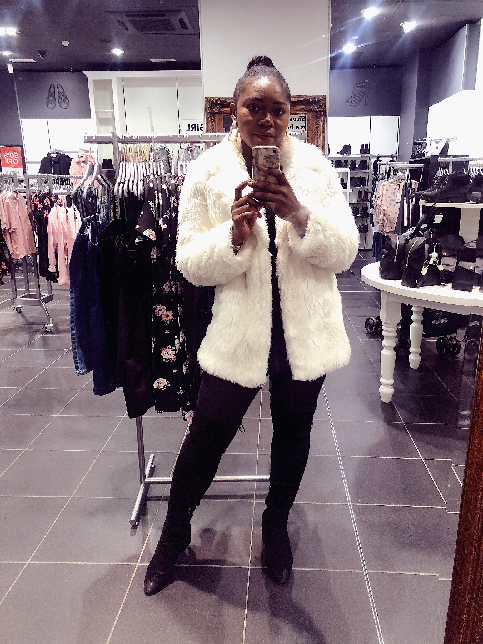 This same day, I was at ASDA supermarket and this lady ran up to me to ask me where I got my fur coat from, sadly informed her it was thrifted, she was a bit disappointed, I got those jacket for £5 fam from a charity shop and I am obsessed with them, see why I didn’t feel the least bit dressed up?