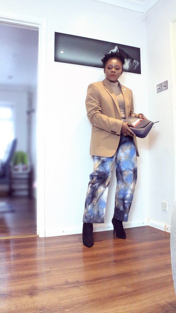 These pair of tie die wide legged pants are denim, yassss! Denim, that’s what sold it to me, its are different, it’s unique, it’s almost look like “adire”, a tie die material made from cotton fabric, I spotted them at a thrift store and it was a no brainer, they had to come home with me, I didn’t even think twice on this one, lol. I have styled it here dressed up with a beige men’s blazer, I thought I’d play up the nude colour on the trouser, and because its wide legged, I opted for a form fitting top, a pair of black pointy toed heeled booties to elongate the legs and a thigh grazing suit for more streamlining and lengthening. What do you think of the styling?